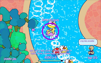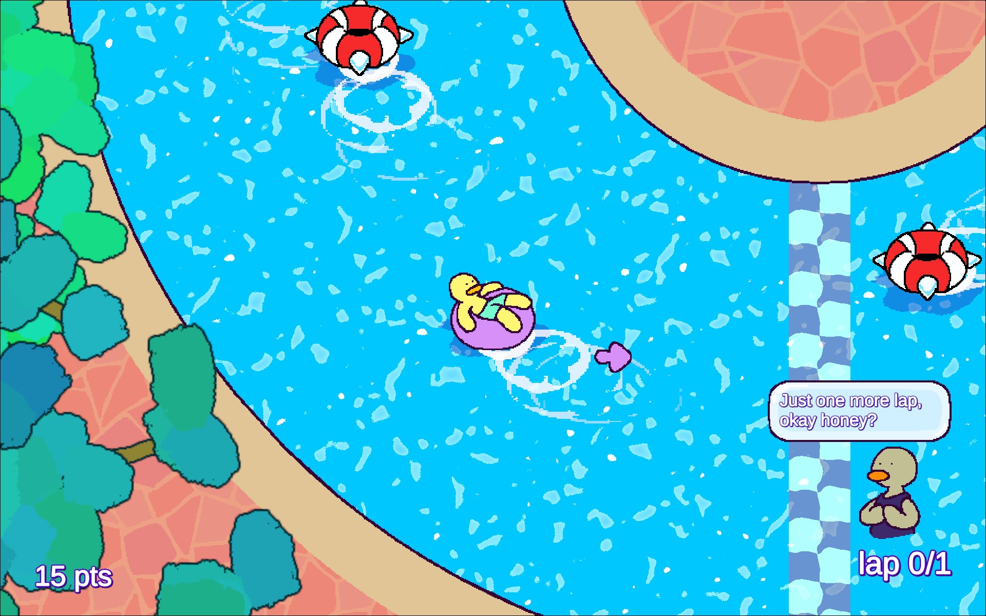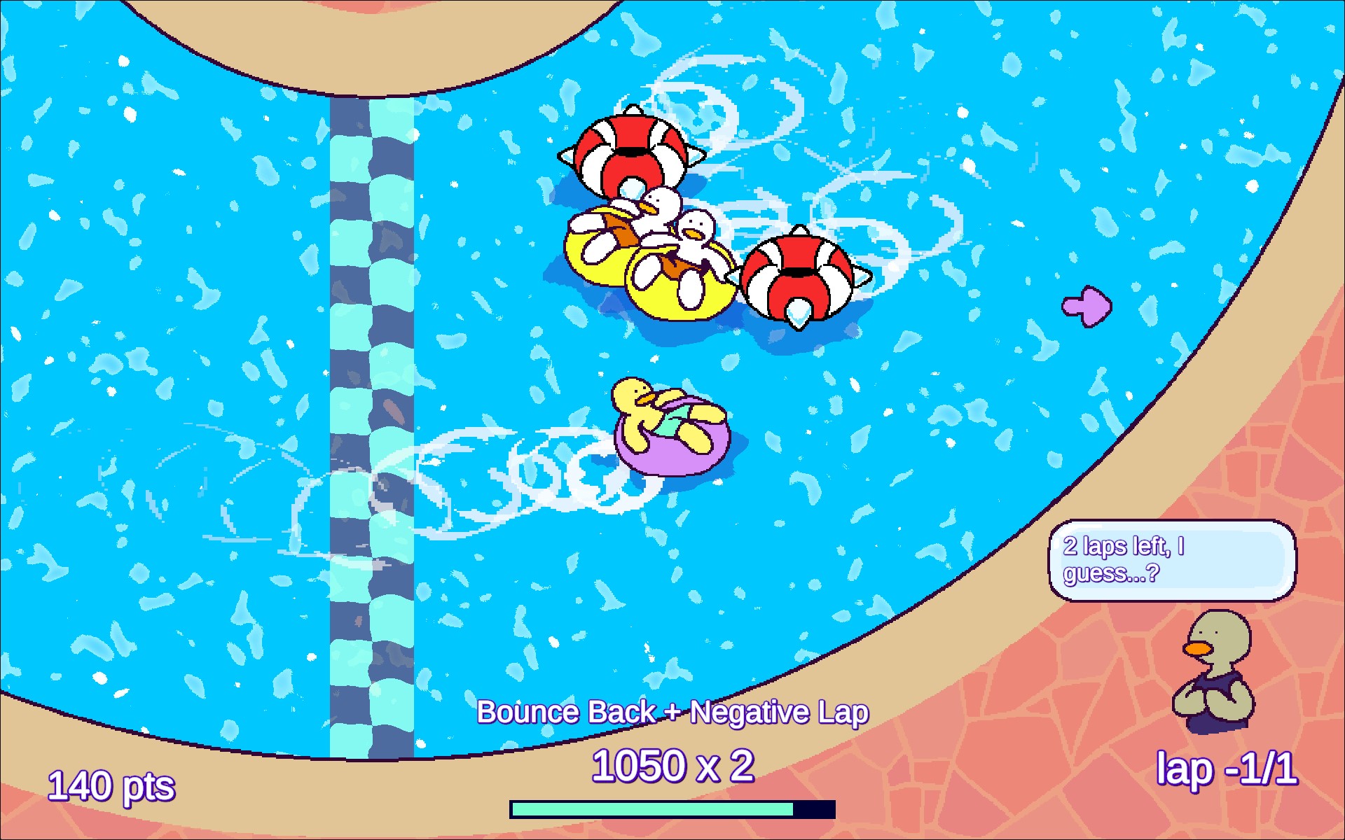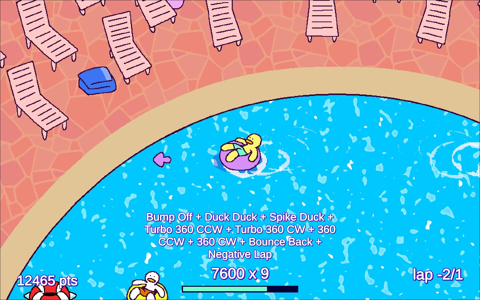 Mom says just one more lap in the lazy river before you have to leave... So swim against the current to prolong your "last lap" as much as possible and go for a high score! Swim counter-clockwise across the finish for additional "negative" laps. Bounce off of other floaters, dive under hazards, spin in circles and complete laps in reverse to increase your trick combo and score massive points. How many unique tricks can you discover and string together?